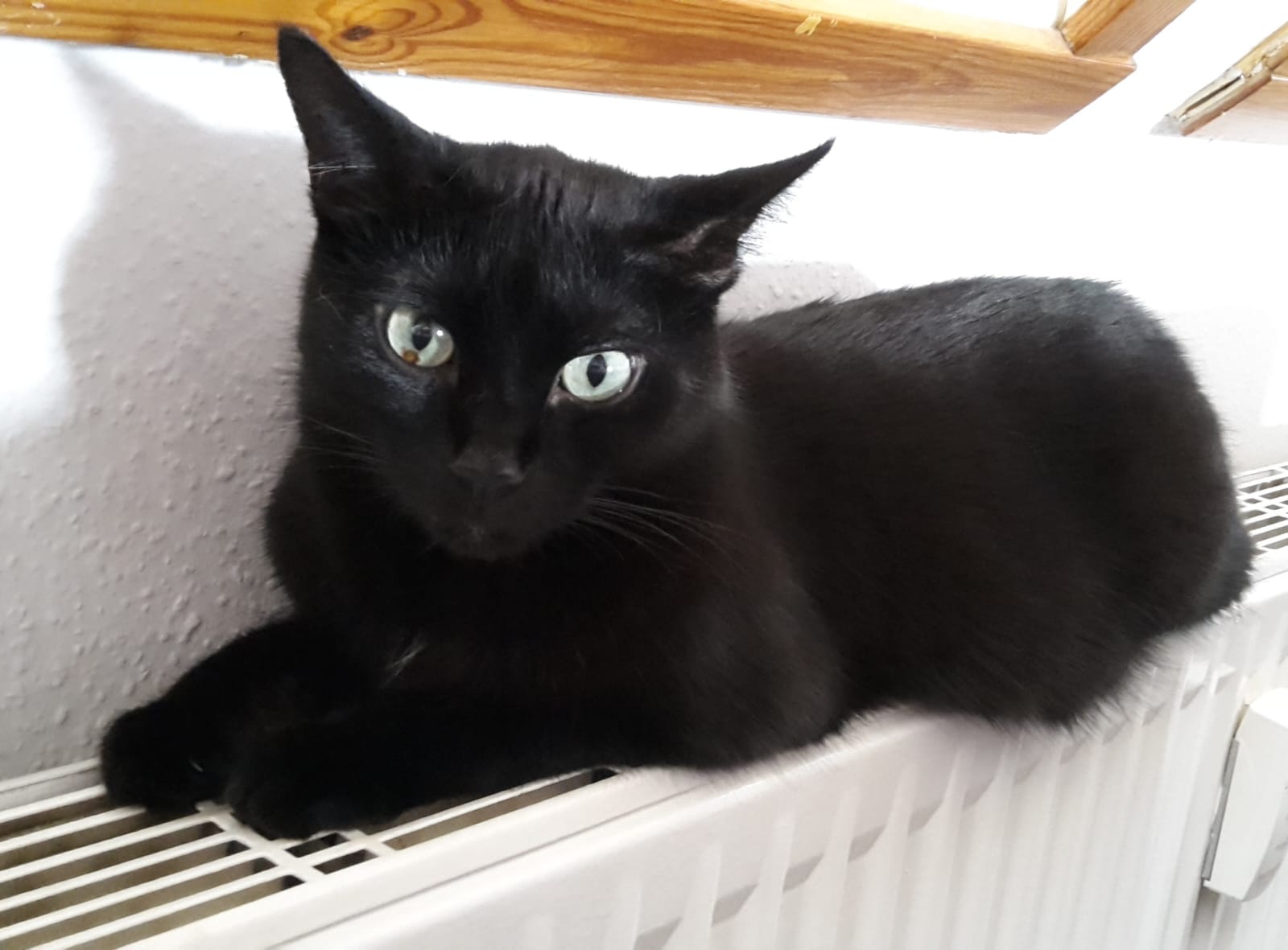 Schwarzer Kater Hades liegt auf einem Heizkörper und schaut nach vorne.